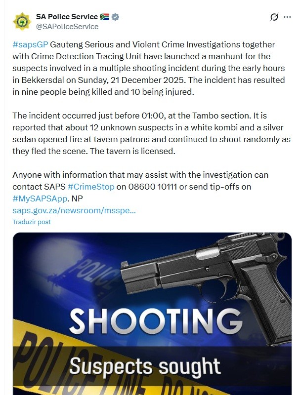 A polícia da África do Sul informou no X que iniciou as buscas pelos suspeitos de um ataque a tiros que deixou nove mortos e dez feridos na madrugada de domingo (21), em Bekkersdal. Segundo a corporação, cerca de 12 homens em uma kombi branca e um carro prata abriram fogo contra clientes de um bar na região de Tambo e fugiram em seguida.